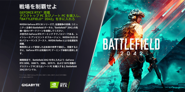 2021年8月25日 - GIGABYTE Technology Co., Ltd. 台湾・新北市 - コンピュータテクノロジーで世界をリードするGIGABYTE Technologyは、2021年8月24日~9月14日の期間中、対象のNVIDIA GeForce RTX 30シリーズ搭載ノートPCまたはデスクトップPCをご購入いただいたユーザーに、Electronic Arts(EA)社の最新FPSゲーム「Battlefield 2042」PC版(10月22日発売予定)のゲームクーポンコードをもれなくプレゼントするゲームバンドルキャンペーンを実施いたします。