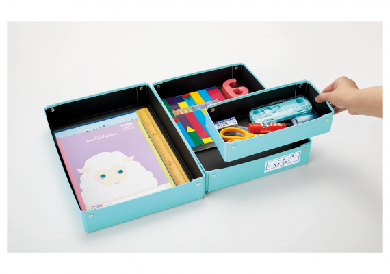 小学生が学校机の引き出しとして、文房具や教科書を収納するお道具箱。本製品は、落としても割れる心配がない紙製で、安心してお使いいただけます。また、子どもが簡単に整理整頓できるよう、仕切り箱が付いているのが大きな特長です。文房具を使用頻度や大きさ別に分けて収納したり、前後好きな位置にスライドしたり、中身を入れたまま箱ごと取り出すことも可能。子どもが自分で整理収納しやすくなっています。