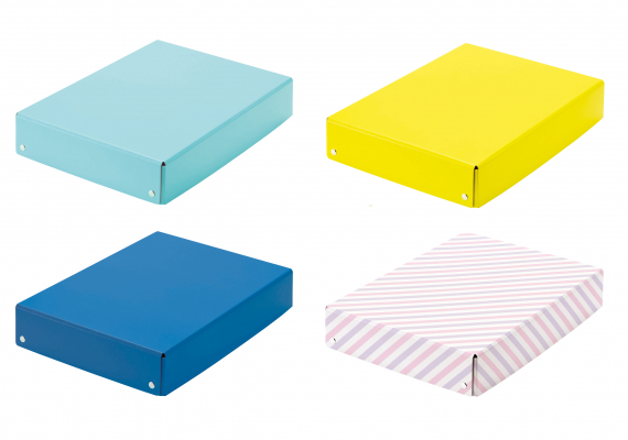 内側には、鉛筆の芯などで黒くなっても目立ちにくい黒い紙を使用。四隅は外側・内側ともに角丸加工を施しているので、手や身体に当たっても痛くありません。フタと底どちらにも、A4クリアーホルダーやフラットファイル、30cmものさしをしっかり収納できます。定番カラーは、男女問わず選びやすい、ブルーとイエローの2色。ほかに限定カラーとして、ロイヤルブルーと、パープルとピンクのストライプ柄の2色をご用意しました。