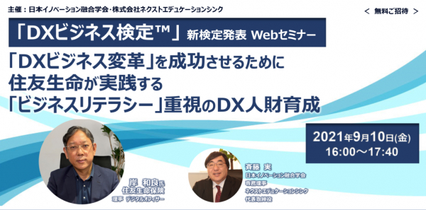 DX(デジタル・トランスフォーメーション)手法で、企業人財のDX情報感度、イノベーティブ度、ビジネスコンピテンシー等の先進の客観アセスメントを独自開発し、組織人財分析コンサルで、累計1400社、400万人以上の人財分析実績をもつ、株式会社ネクストエデュケーションシンク(略称:NET)(本社:東京都文京区、代表取締役:斉藤実)は、DX時代の新ビジネス検定である【「DXビジネス検定(TM)」発表Webセミナー】を2021年9月10日に開催することを発表しました。