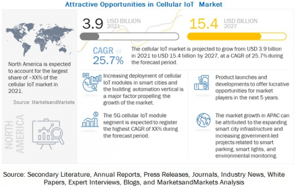 MarketsandMarketsは発表資料において、セルラーIoT市場は2021年中に39億ドル、2027年までには154億ドル、CAGR(2021年~2027年)で25.7%に成長するとの予測結果を公開しました。