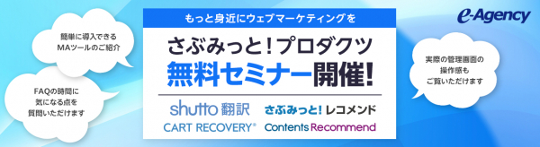 “おもてなしを科学する”株式会社イー・エージェンシー(東京都千代田区、代表取締役:甲斐真樹、以下イー・エージェンシー)が提供する、Webサイト翻訳サービス「shutto翻訳(しゅっと ほんやく)」、カゴ落ち特化型MAツール「カートリカバリー」、SaaS型レコメンドエンジン「さぶみっと!レコメンド」「コンテンツレコメンド」におきまして、無料ウェビナーを開催することとなりました。