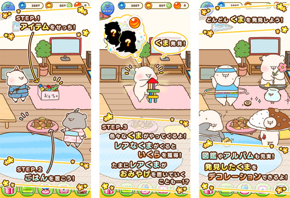 『アイテム』と『ごはん』を使って「くま」を発見していくゲームです。組み合わせによって発見できる「くま」が変わるので、色々な組み合わせを試してたくさんの「くま」を発見することができます!