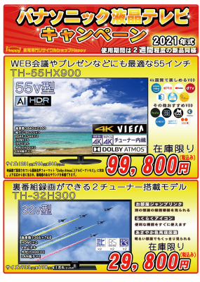 この “パナソニック液晶テレビキャンペーン”は、8月30日(月)より、Happy西葛西店およびオンラインストアにて開催いたします。商品は台数に限りがあり、なくなり次第終了となりますので、新規ご購入やお買い換えをご検討の際は、この機会を是非ご利用ください。