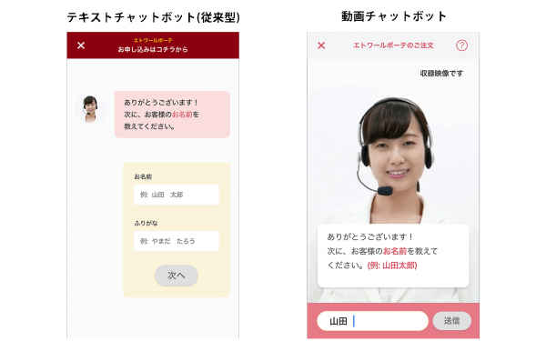 今回、追加機能として発表した業界初となる動画チャットボットは、これまでテキストで商品購入まで案内していた内容を、画面上に表示されるオペレーターが、動画と音声でガイダンスを行う新機能です。従来型のテキストチャットボットと比べ、動画と音声の案内があることで、ECサイトを利用するユーザーに対して安心感を与えるサポートが可能となっております。