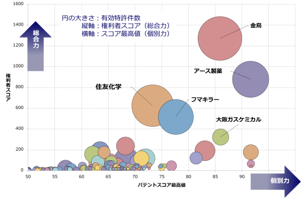 殺虫剤は、一般家庭などにおいて発生する害虫(ゴキブリ、蚊、ハエ、ダニ、シロアリ、ヤスデなど)を駆除する際に、広く使用されています。本調査では、日本の特許庁で公開されている、「殺虫剤関連技術」全般について、個別特許の注目度を得点化する「パテントスコア」をベースに、特許の質と量から総合的に見た評価を行いました。