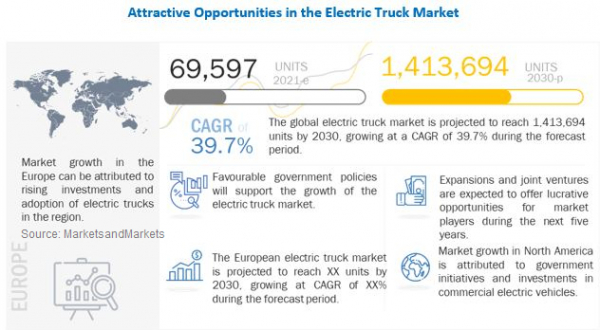 MarketsandMarketsは発表資料において、電気トラック市場は2021年中に6万9,597台、2030年までには予測期間内CAGR39.7%となる141万3,694台に達するとの予測結果を公開しました。
