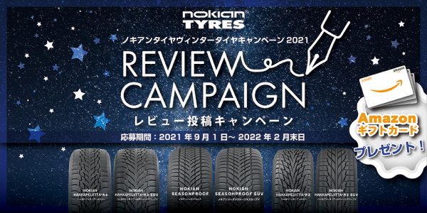 Nokian Tyresのキャンペーン専用ページに口コミをご投稿頂いたユーザーの方から抽選で100名様にAmazonギフトカードをプレゼントいたします。