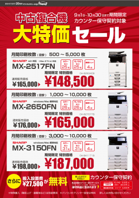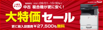 今回の “中古複合機 大特価セール” は、9月1日(水)から10月30日(土)までの期間中、対象のSHARP製複合機(3機種)を、新品購入価格の30%程度の通常販売価格から、さらに特別価格にてご提供するというもの。販売する商品は、中古品を安心・快適にご使用いただくために、当社独自基準による徹底したクリーニングと、専門スタッフによる厳しい商品検査と動作確認を行った、新品同様の“極上中古品”ばかりです。