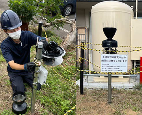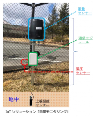 「雨量モニタリング」は、雨量センサーに加え、土壌湿度センサーと温度センサーにより、局地的な雨量および土中水分量、温度を同時に計測できることが特徴です。各センサーで計測したデータを総合的に分析し、土砂災害や河川氾濫等の予見に資する情報を提供します。