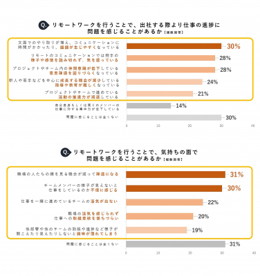業務の進捗のほか、気持ちの面でもネガティブな感情を抱きやすくなり、チームメンバーと「疎遠になる」(31%)、「仕事をしているのか不信に感じる」(30%)など、会社への帰属意識や仲間意識を損なうことが危惧されている。