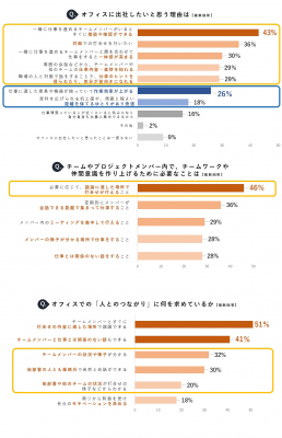 「チームメンバーとすぐに打合せの内容に適した場所で議論できる」(51%)「チームメンバーと仕事とは関係のない話もできる」(41%)といった直接的なコミュニケーションに加え、「チームメンバーの状況や様子が分かる」(32%)といった空気感を共有しながら一緒に過ごすことも求められています。