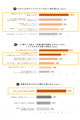 オフィスにおける“いごこちのよさ”のポイントは、「周囲の音」(40%)や「周囲の視線」(31%)など周囲の環境。仕事の効率を上げたいときは「周りの視線が完全に遮られた個室」(42%)に加え、「人の気配を感じられるセミクローズドなスペース」(32%)など、一部が遮られ周囲の様子が分かる一人用ブースのニーズも高い。