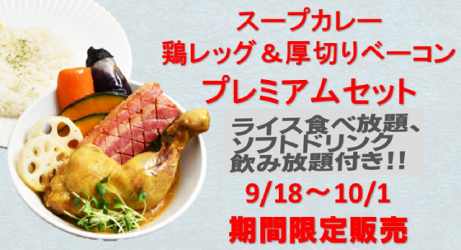 有限会社マジカルエッグ(本社:東京都足立区、代表取締役:髙山昌之)が運営する墨田区で唯一のスープカレー専門店の「お江戸スープカレーちゃはや庵」(所在地:東京都墨田区)は9月18日(土)、スープカレーの「鶏レッグ&厚切りベーコンのプレミアムセット」の提供を開始します。骨付きチキンレッグと厚切りベーコンを一緒に盛りつけました。10月1日(金)までの期間限定です。