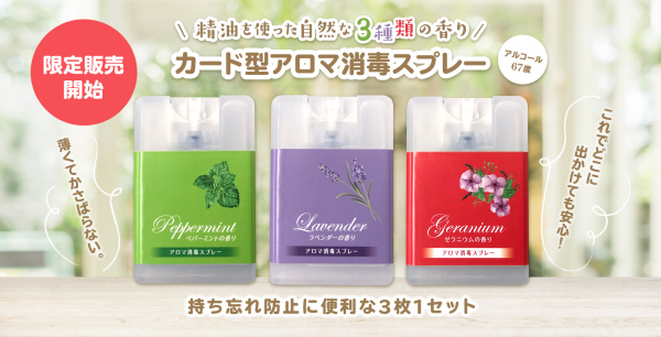 弊社にも「お店の店頭には消毒用アルコールがあるけど、手荒れするし、肝心な消毒したいタイミングで手元にない」とのお声が多く寄せられていました。そこで今回、『カード型アロマ消毒スプレー アルコール67度』を試験的にですが数量限定で販売スタートすることにいたしました。
