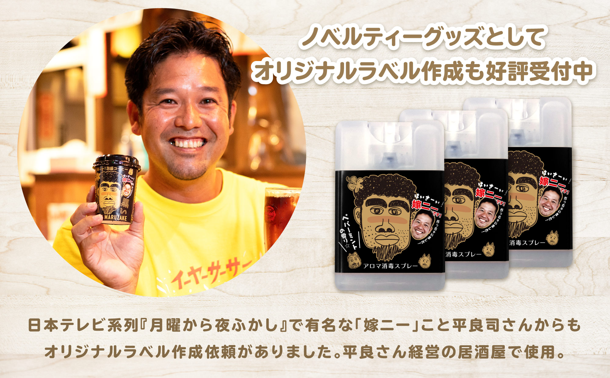 日本テレビ系列『月曜から夜ふかし』で有名な「嫁ニー」こと平良司さんもペパーミントの香りでオリジナルスプレーを作成。平良さんが経営する居酒屋でも好評です。