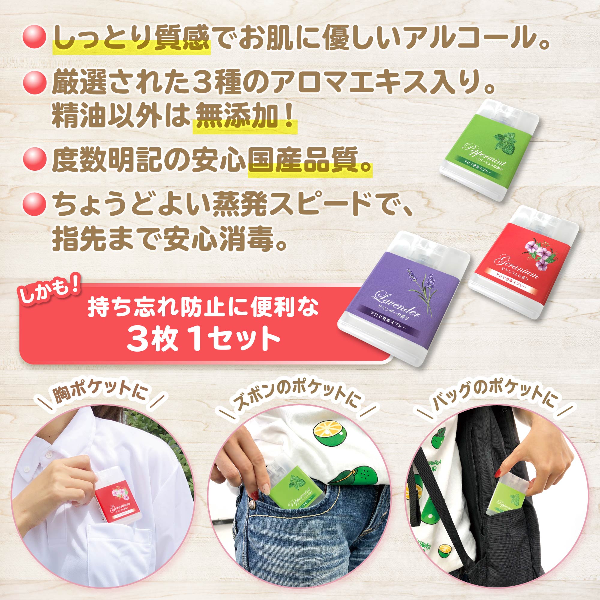 ◆ 商品特徴3)3種のアロマ精油を使った香りつきの消毒スプレー3枚1セット