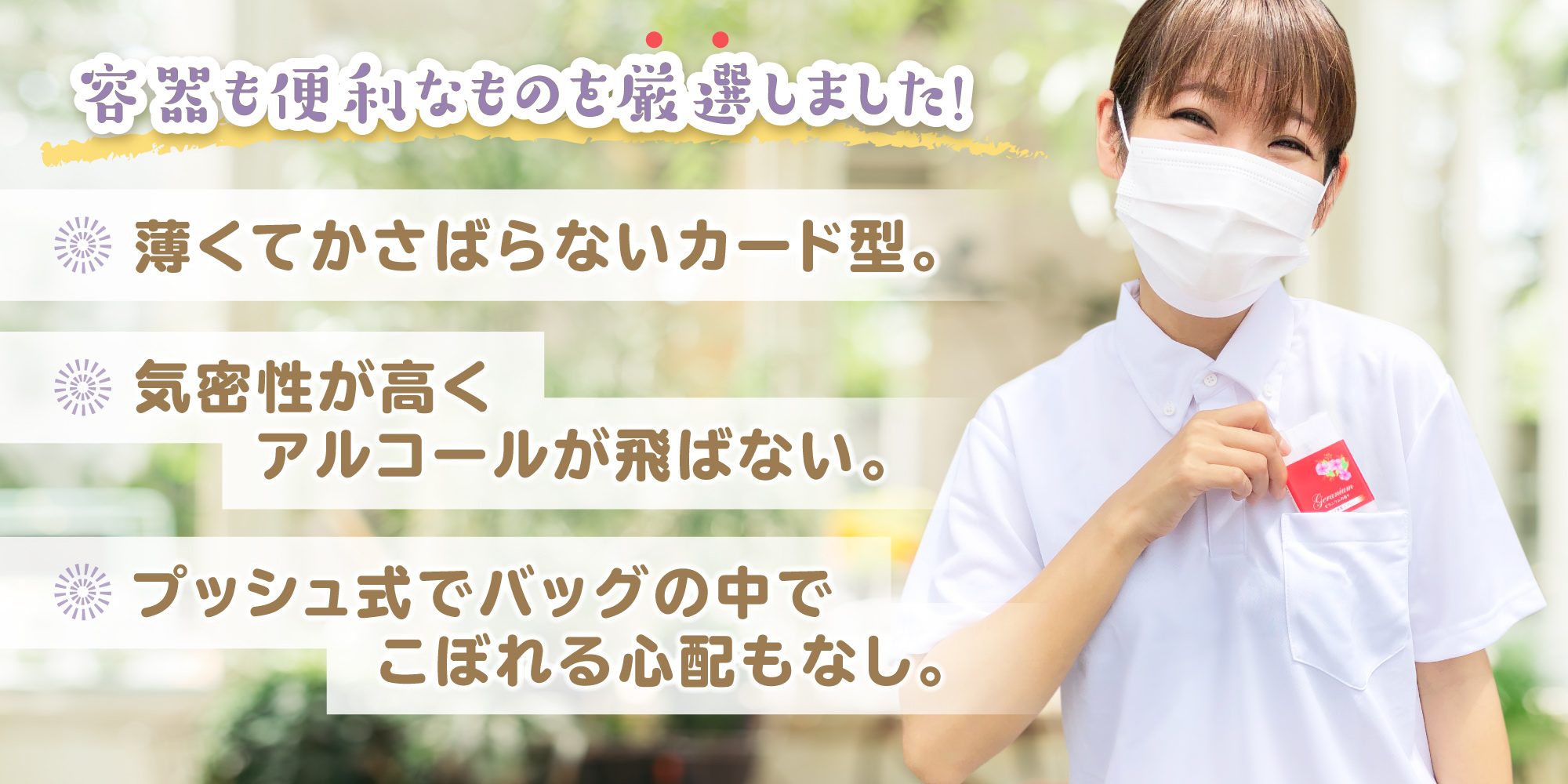 お客様からいただいた「ついつい持ち忘れてしまって、外で買うんだけど、外で買うものは手荒れする・度数が明記されていなくて不安…」というお声をもとに、携帯しやすくかさばらないカード型を採用。手のひらサイズで、持ち運びやすく、持ち忘れ防止にも便利な3枚1セットでの販売となっています。