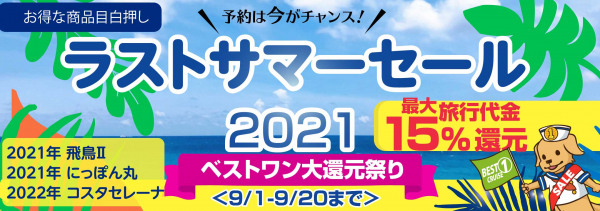 クルーズ予約サイト「ベストワンクルーズ」運営の株式会社ベストワンドットコム(本社:東京都新宿区、代表取締役:澤田秀太)は、ご好評いただいておりました「ベストワンスーパーサマーセール」に引き続き、9月1日(水)より「ラストサマーセール2021」を開始いたしました。