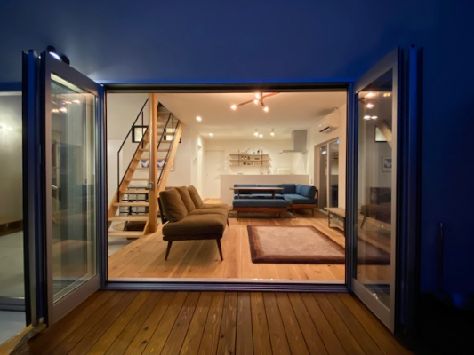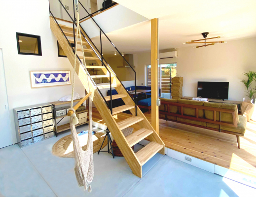 室内にはエンターテイメントを含ませて楽しむという暮らしのアイディアが詰まっています。ハンモックのある土間でぶらぶらと揺られながらバルコニーを眺める「室内アウトドア」を楽しんだり、白壁を使ってプロジェクターの映像を投影してホームシアターをしたり、外に行かなくても家の中で楽しく過ごせる遊びの要素を散りばめました。