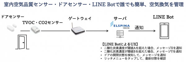 エルスピーナヴェインズ株式会社(本社:群馬県高崎市、代表取締役:青谷 浩二)は、室内空気品質(TVOC・CO2)センサー、ドアセンサーとLINE Botを連携させ、手軽に室内換気を促進できるソリューションパッケージを、2021年9月より発売いたします。