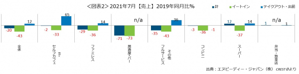 外食・中食市場の2021年7月は、売上19.9%減(2019年同月比)
