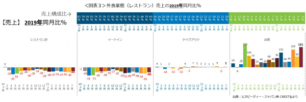 外食業態計(レストラン計)の売上2019年同月比を利用形態ごとにみてみると(図表3)、出前(デリバリー)の大幅増が続いており、2020年4月は28%増、5月は204%増、6月は104%増、7月は75%増、8月は23%増、9月は44%増、10月は39%増、11月は68%増、12月46%増、2021年1月は81%増、2月132%増、3月46%増、4月49%増、5月は159%増、6月は95%増、そして7月は181%(いずれも2019年同月比)と、2020年2月以降で最高の2020年5月に次いで2番目の大幅増でした。