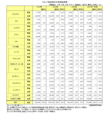 2021年のゴルフ用品市場規模(メーカー売上高ベース)は、前年比117.6%の2,730億8,000万円と予測する。これは、2018年以降で最も高い数値となっている。この市場規模予測はゴルフ用品メーカー各社からの売上高見込を最大の算出根拠としているが、メーカー各社とも2021年は「コロナ前の水準+αを目指す」という姿勢が明確になっている、ということになる。