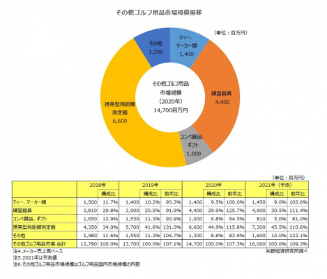 本調査で、2020年唯一プラス成長を果たしたカテゴリーが、その他ゴルフ用品(ティー・マーカー類、練習器具、コンペ商品・ギフト、携帯型飛距離測定器、その他)である。