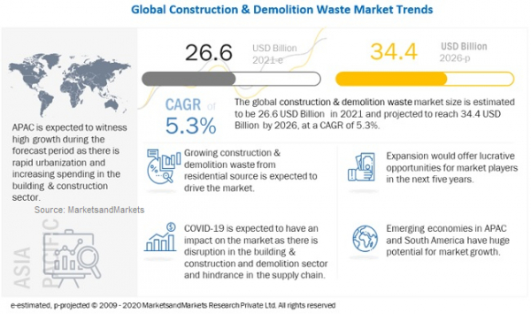 Construction & Demolition Waste Market by type (Sand, Soil & Gravel, Concrete, Bricks & Masonry, Wood, Metal), Source (Residential, Commercial, Industrial, Municipal), & Region (APAC, North America, Europe, MEA, & South America) - Global forecast to 2026