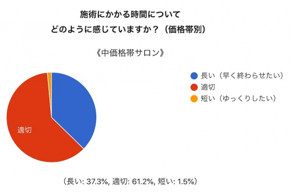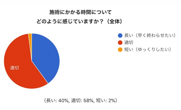 「施術にかかる時間についてどのように感じていますか?」の質問では、長いが40%、適切が58%、短い(もっとゆっくりしたい)がわずか2%という結果となりました。