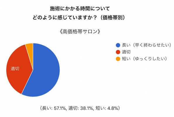 高価格帯の美容室になるほど「長い」と感じる人の割合が多くなったことは、高価格帯サロンではしっかり時間をかけて丁寧に施術をすることが一つの要因かもしれませんが、それでも「長い」と感じるということは、ゆっくり時間をかけてくれることよりも、確かな技術と丁寧で “スピーディー” な施術を美容室に求めている人が多いことを示しているのかもしれません。