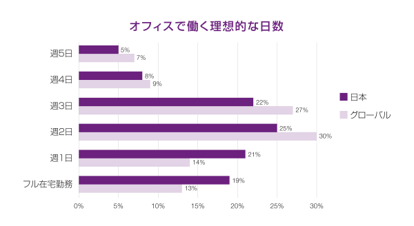 オフィスで働くのに最も理想的な日数を聞いたところ、日本の会社員は1位「週2回」、2位「週3回」という結果になりました。世界的に見ても、「週2回」が最も多い回答結果(30%)で差異はありません。リモートワークが定着していく中で、働く人の意識が変化していることが覗えます。