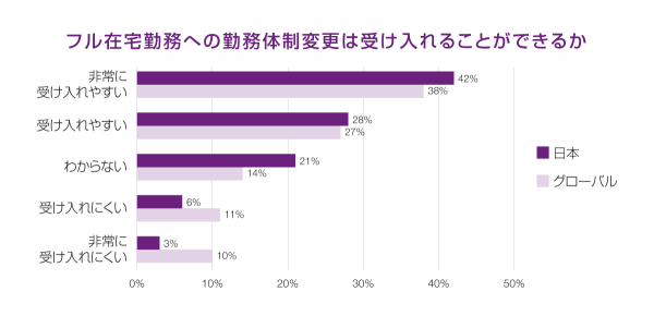 日本の回答者で、毎日オフィス勤務という旧来の働き方に戻りたいと答えた人は、わずか5%に留まり、逆にフルリモートワークとなった場合、その勤務形態を受け入れにくいと回答した人は3%という結果になりました。フルリモートワークを受け入れにくい理由のトップ3は、1位「気が向いたときにオフィスに行くことができる」(54%)、2位「オフィスの方が生産性が高いと感じる」(36%)、3位「対面式の会議や同僚との交流がある」(25%)が挙がりました。世界全体では、10%が「フルリモートワークは受け入れにくい」と回答しています。