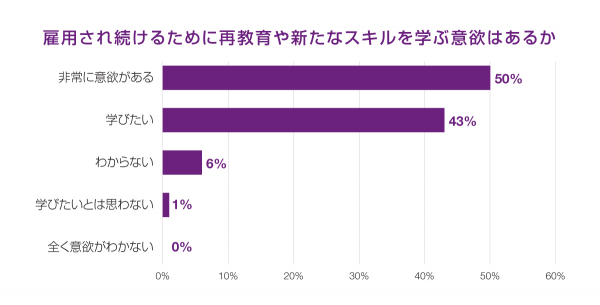 また、93%の日本の回答者が、雇用され続けるためには再教育や新しいスキルの習得が必要だと考えています。スキルアップを望んでいながらスキルアップ実現に至っていない人が挙げた理由としては、1位「経済的なコスト」(43%)、2位「その投資が報酬アップにつながるという保証がない」(17%)、3位「仕事の安定性や昇進が確約されていない」(33%)という結果になりました。