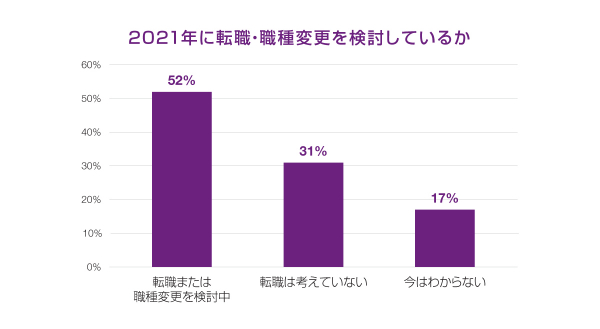 自分のスキルに対する不安要素を抱えながらも、日本の回答者は、「2021年にキャリアチェンジ(職種変更を視野にいれた転職)をする」(23%)、または「転職する」(29%)という意向を示しています。また、現状維持と回答したのは、わずか31%という結果から、転職等の変化を求めている人の割合が高いことがわかりました。
