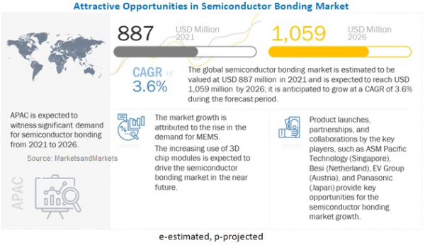 MarketsandMarketsは公開資料において、半導体ボンディング市場は2021年中に8億8700万ドル、2026年までには10億5900万ドル規模となり、2021年から2026年までのCAGRは3.6%になるとの予測結果を発表しました。