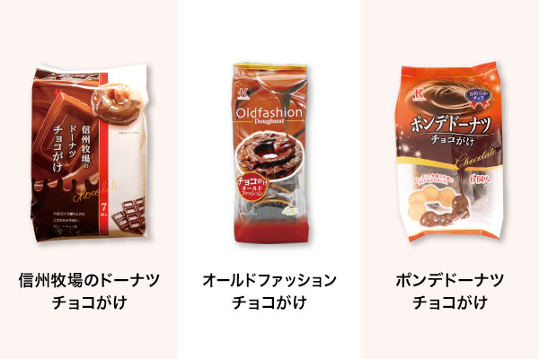 『信州牧場のドーナツチョコがけ』、『オールドファッションチョコがけ』、『ポンデドーナツ チョコがけ』は濃厚、しっとり食感、もちもち食感等の特色ある生地になめらかチョコを合わせる事で、それぞれの特色ある生地とチョコとの食感や、味わいのコントラストをお楽しみ頂ける商品設計としました。