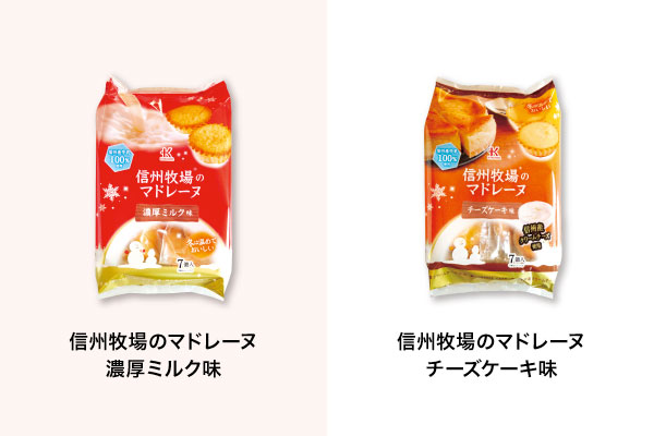 『信州牧場のマドレーヌ濃厚ミルク味』、『信州牧場のマドレーヌチーズケーキ味』は『お手軽本格洋菓子』をテーマに『信州牧場のマドレーヌ濃厚ミルク味』では信州産牛乳を100%、『信州牧場のマドレーヌチーズケーキ味』では信州産100%の生乳で作ったクリームチーズを使用し、水を使用せず仕上げたこだわりの生地を使用する事で、エンドユーザに濃厚で本格的な味わいのマドレーヌを手軽にお楽しみ頂ける様商品開発を行いました。またパッケージは冬季限定パッケージとなっており、視覚的にも冬季の楽しいひとときを演出します。