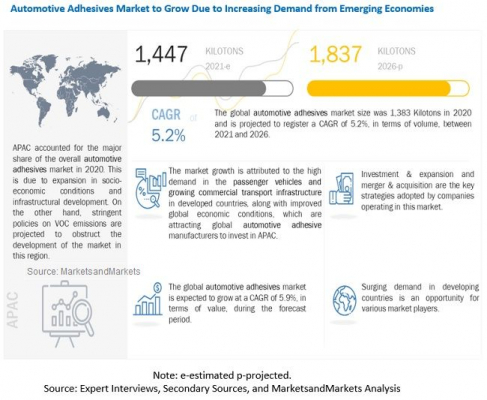 MarketsandMarketsは公開資料において、自動車用接着剤は2020年の66億ドルから93億ドルへ、2021年から2026年までのCAGRで5.9%の成長するとの予測結果を発表しました。軽量かつ低炭素車両の成長傾向とアジア太平洋地域からの自動車用接着剤への高い需要が自動車用接着剤市場の成長促進要因となっています。自動車用接着剤の成長機会は特にインド、中国、ブラジル、メキシコをはじめとする新興国にあります。