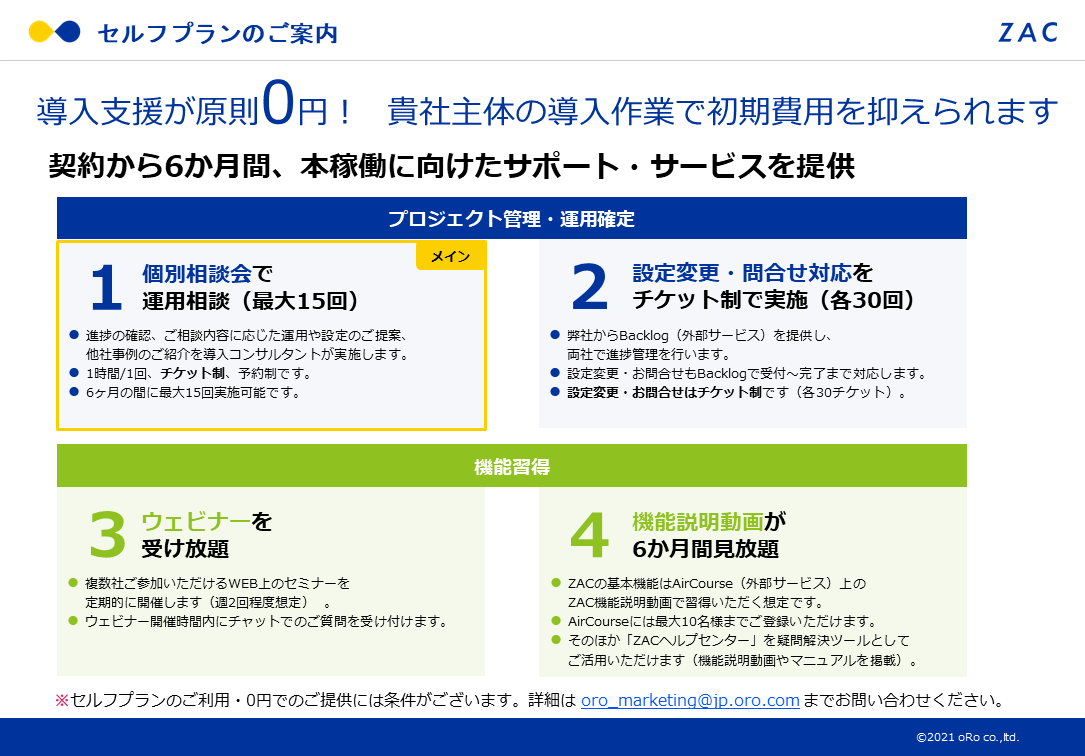 株式会社オロ(東京都目黒区 代表取締役社長 川田 篤 以下「オロ」)はこの度、クラウドERP「ZAC」の導入支援サービスにおいて、2021年9月13日より「セルフプラン」を新たに提供開始することをお知らせします。セルフプランでは、通常数百万かかる導入支援費用が、諸条件* を満たす場合に0円となるため、中小企業のシステム導入における費用負担が大幅に減る見込みです。