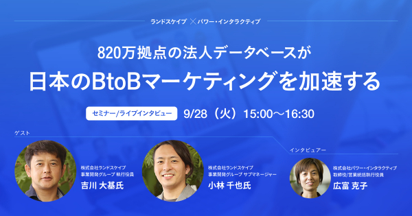株式会社パワー・インタラクティブは、株式会社ランドスケイプ様をゲストにお迎えした無料ウェビナー『820万拠点の法人データベースが日本のBtoBマーケティングを加速する』を、9月28日に開催します。