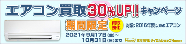 Happy “エアコン買取再開キャンペーン” と題した今回のキャンペーンは、製造年数5年以内のエアコンが対象。10月31日(日)までの期間中、対象商品の通常査定からさらに30%アップで買い取りさせていただきます。