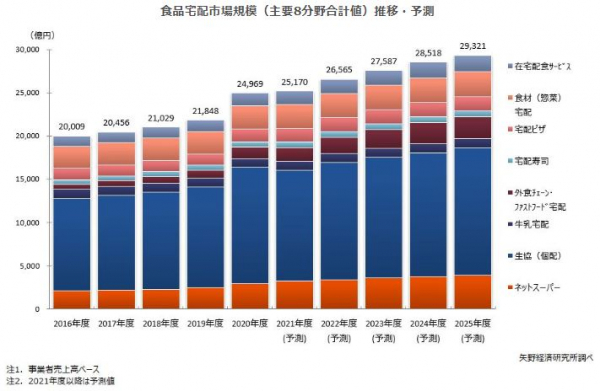 食品宅配市場は2020年度から2025年度までのCAGR(年平均成長率)が3.3%と引き続き順調に推移し、2025年度の食品宅配市場規模(主要8分野合計値)は2兆9,321億円に達すると予測する。