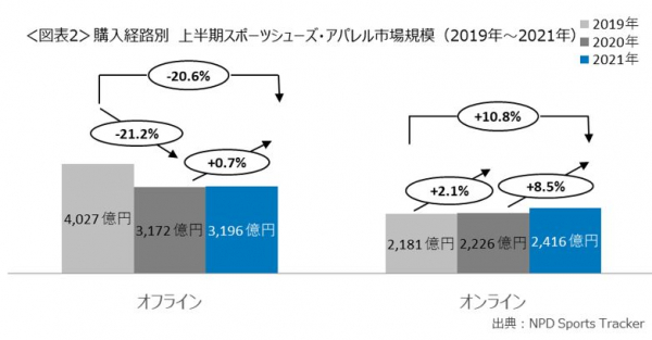 購入経路を見ると(図表2)、オンラインでの購入金額が前年同期比8.5%増と大きく増加しました。また2019年同期比では10.8%増となります。しかしオフラインでは前年同期比0.7%増、2019年同期比では20.6%減と市場規模が大きく減少しているため、スポーツシューズ・アパレル市場全体としてはマイナスでした。