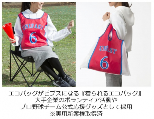 「着られるエコバッグ」誕生のきっかけは、ある企業からの依頼で実業団野球大会の応援ビブスを製作したことです。ビブスは会場にて無料で配布されるノベルティであったため、試合が終わるとその場でごみ箱に捨てられている様子を目にし、さみしさとともに、地球環境への悪影響も懸念しました。思い出として残してもらえるような付加価値を付けたいと考えた結果、エコバッグの形状がタンクトップに似ており、「着られたら面白いんじゃないか」とひらめいたことで商品化に至り、実用新案権も取得しました。大手企業のボランティア活動やプロ野球チーム公式応援グッズとして採用されています。