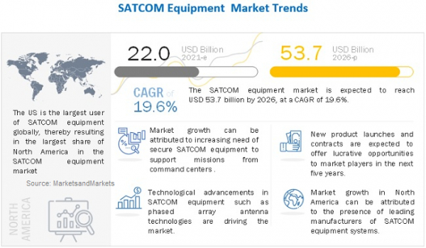 MarketsandMarketsは公開資料において、衛星通信(SATCOM)機器市場は2021年中に220億ドル、2026年までには537億ドルに成長し、CAGRは19.6%になるとの予測結果を発表しました。衛星通信(SATCOM)機器は商業および防衛産業における通信のために不可欠なものです。低軌道(LEO)衛星の展開と通信向け衛星コンステレーションにより世界中で需要が増加しています。その他の市場成長要因としては、KuおよびKaバンド衛星への需要増と成長を続けるカスタマイズされた移動型SATCOMアンテナを必要とする軍用と商用セクタにおける様々な用途向けの自動運転車およびコネクテッド車両のフリート契約の増加が挙げられます。