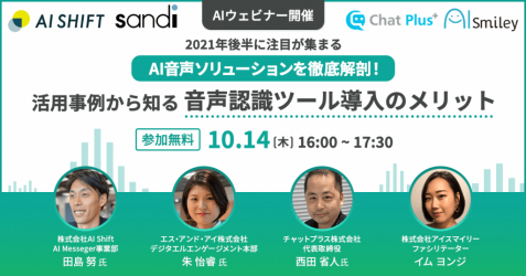 人工知能を搭載したサービスの資料請求ができるAIポータルメディア「AIsmiley」を運営するアイスマイリー(東京都渋谷区、代表取締役:板羽晃司)は、10月14日(木)16時から「2021年後半に注目が集まるAI音声ソリューションを徹底解剖!活用事例から知る音声認識ツール導入のメリット」をテーマにウェビナーを開催いたします。