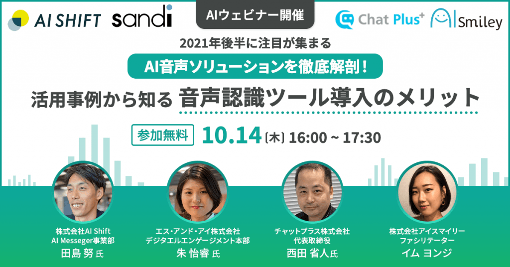 コロナ禍により利用促進したAI技術は数多くありますが、音声認識AIはその中でも活用範囲が幅広く、産業、ビジネス、日常生活を網羅して利用されております。今回のウェビナーでは、2021年後半に注目が集まるAI音声ソリューションを徹底解剖いたします。チャットボットとは違うボイスボットの世界、コールセンターでの音声認識AIソリューション、議事録が自動作成できるオンライン会議ツール等について最先端のAI企業3社が活用事例を紹介します。最新の音声認識AIサービスに興味のある方はぜひご参加ください!