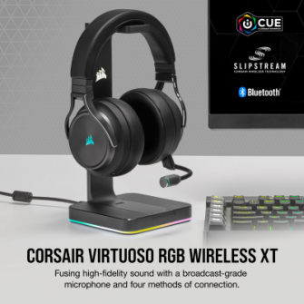 VIRTUOSO RGB WIRELESS XTは、高音質コーデックaptX(TM) HDによるBluetooth接続に対応したプレミアムワイヤレスゲーミングヘッドセットです。CORSAIR独自の通信技術 SLIPSTREAM CORSAIR WIRELESS TECHNOLOGYによる2.4GHz超低遅延ワイヤレス接続や、USBおよび3.5mmプラグ有線接続と合計4種の接続方式に対応します。更にBluetooth接続したスマホで通話しながらSLIPSTREAM接続したPCゲームの音声を聞くなど同時接続にも対応。ボイスチャット、動画配信とゲームプレイをシームレスに接続し、これまでにない音質と利便性を提供します。